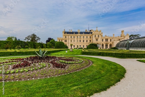 Lednice, Czech Republic - May 28 2019: Famous Lednice castle in South Moravia with yellow facade. Garden with green lawn, flowers and sand footpath. Sunny spring day, blue sky, white clouds.
