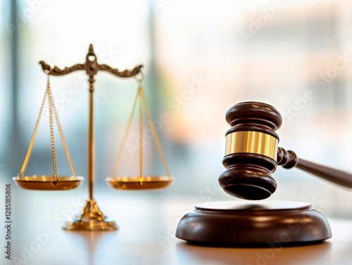 Legal Justice Symbolized by Gavel and Scales Representing Law and Order in Courtroom Setting.