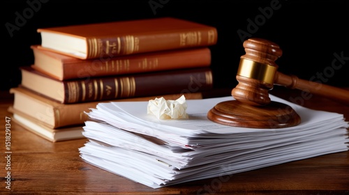 Legal materials with a gavel and crumpled paper on a wooden table in a dimly lit setting