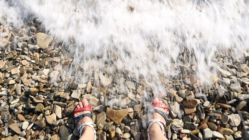 legs of a person in wicker sandals in American flag colors standing on a rocky beach in a spray of sea waves