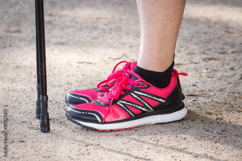 Legs of elderly senior woman and nordic walking sticks, sporty lifestyles