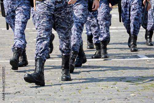 Legs of soldiers of military forces in camouflage, men walking down the city street