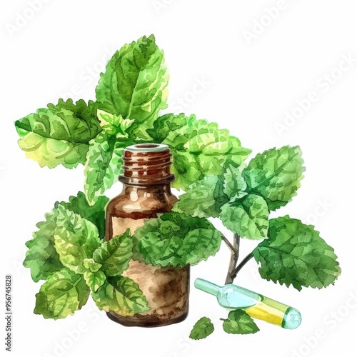 Lemon Balm and Essential Oil for Aromatherapy. Watercolor Illustration of Medicinal Plant for Spa and Wellness