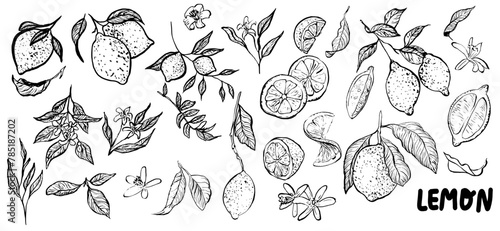 Lemon fruit, flower , leaves hand drawn vector sketch illustration. Purchase poster, print, home decoration, menu cover, invitation, design template.