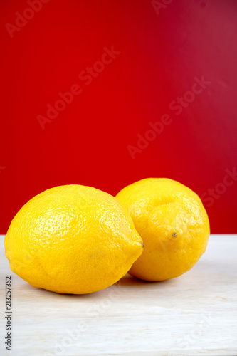 Lemon on a wooden table over red background