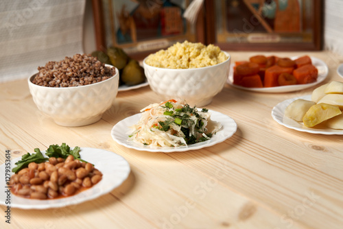 Lenten food on a wooden background symbolizes simplicity and humility, which help the believer focus on spiritual life in the days of Great Lent