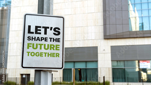 Let's Shape The Future of Work sign in a downtown city setting
