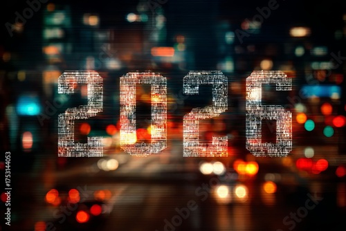 letter "2026" with digital effect, abstract night city background