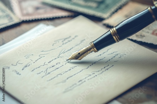 letter being written, with the pen poised on the paper, surrounded by envelopes, stamps, and decorative stationery items