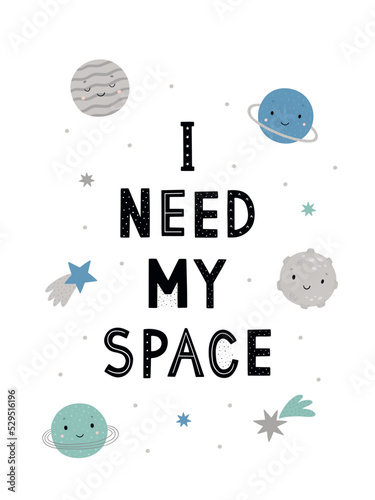 Lettering I need my space. Funny cartoon planets. Space vector illustration