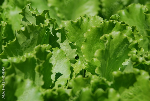 Lettuce leaves close-up. Under the sunshine, large, wide green lettuce leaves have grown. Herbaceous annual plant of the Aster family. Refers to valuable vegetable crops.