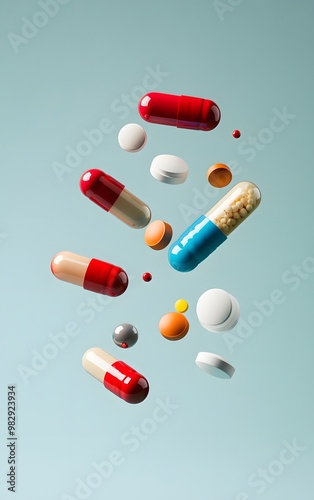 Levitating capsules and tablets a medicine on a light blue background