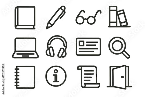 Library icons: books, laptop, headphones, documents, and more