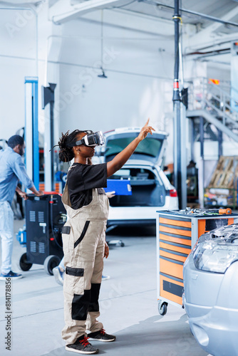Licensed engineer in auto repair shop using virutal reality goggles to visualize car components in order to fix them. African american woman using VR technology while working on damaged vehicle engine