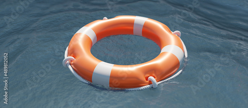 Lifebuoy on ocean water surface. Life preserver float ring, rescue life. Overhead view. 3d render
