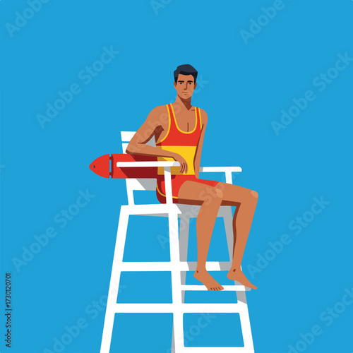 Lifeguard sits on white high chair against solid blue background, relaxed pose