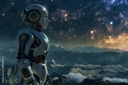 Lifelike robot stands on an extraterrestrial landscape gazing at distant stars