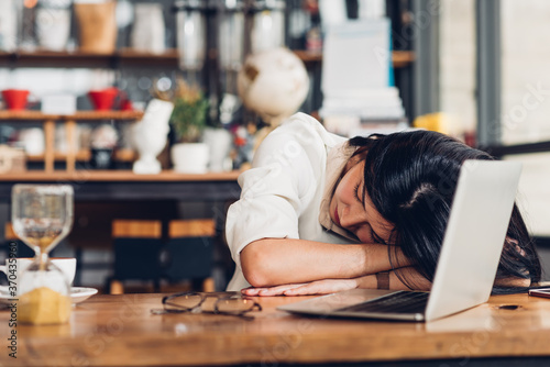 Lifestyle freelance woman he has resting sleeping after hard work long time in coffee shop