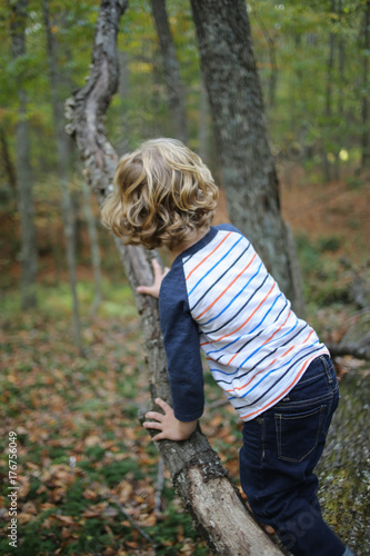 Lifestyle Little Boy with Long Blonde Hair Playing in a Forest on Trees in Autumn