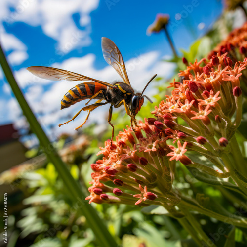 lifestyle photo closeup red headed wasp flying.