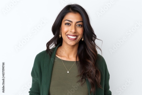 Lifestyle portrait of an Indian woman in her 30s against a white background