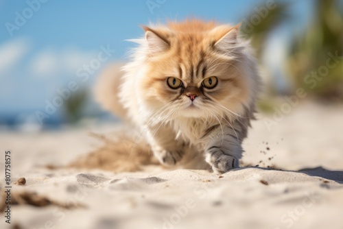 Lifestyle portrait photography of a curious persian cat sprinting while standing against beach background