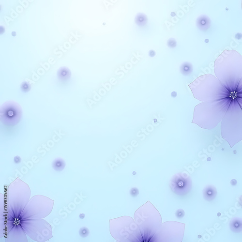 Light blue background with scattered purple flowers and small dots in a soft and airy floral arrangement with a gradient effect