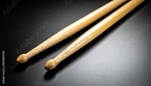 Light brown wooden drumsticks with rounded tips on dark smooth surface.
