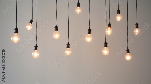 Light bulbs secured by wire dangle before a white wall indoors
