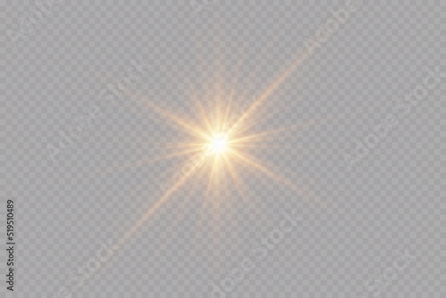 Light effect. Golden bright star, yellow sun. Starlight.