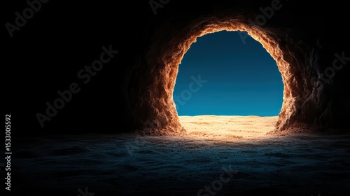 Light Emerging from a Cave Entrance Into a Bright Sandy Landscape Under a Clear Blue Sky