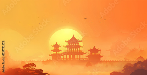 Light golden background with a Chinese aesthetic, silhouette of ancient architecture in the distance, a hazy yellow fog, a Chinese landscape painting style, traditional animation style
