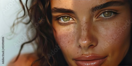 light make up young teen white with freckles ,brunette hair green eyes woman model studio portrait photo with white background great for cosmetics and spa advertisement