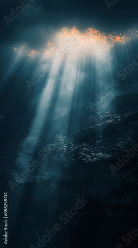 Light rays filtering through the ocean surface into the depths, peaceful and serene underwater scene