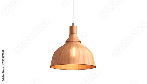 Light wood pendant lamp with a simple bulb casting warm light. Isolated on white