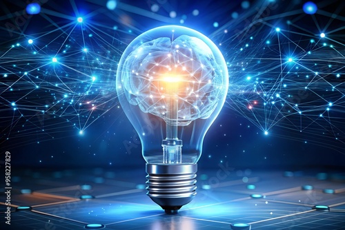 Lightbulb with glowing brain inside on dark blue background. 3D rendering Glowing light bulb with human brain inside on dark background. 3D rendering