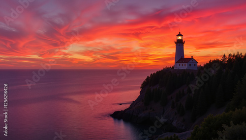 Lighthouse on a cliff at sunset with dramatic colorful clouds and calm ocean