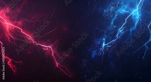 Lightning cracks with electric sparks in blue and red colors on a dark background. Vector illustration of a lightning strike with electric sparks
