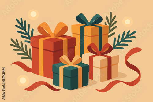 Lights composition vector ribbons illustration pine scene gift festive minimalist flat