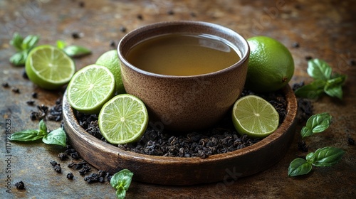 Lime tea in a rustic bowl with loose leaf tea and lime slices.