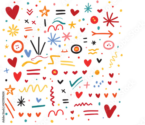 Line arrow hand drawn shape brush underline stroke element vector set. Hand drawn doodle sketch arrow, circle, star brush stroke scribble underline icon. Marker doodle heart vector illustration.