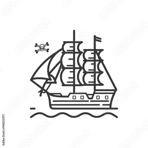 Line art illustration of a pirate ship with a skull and crossbones