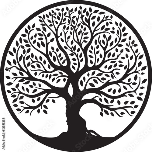 line art nature logo vector design oak tree inside circle, abstract tree logo symbol inside circle