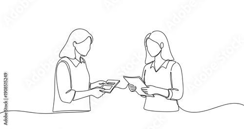 Line art of two young caucasian females discussing documents. No editable stroke