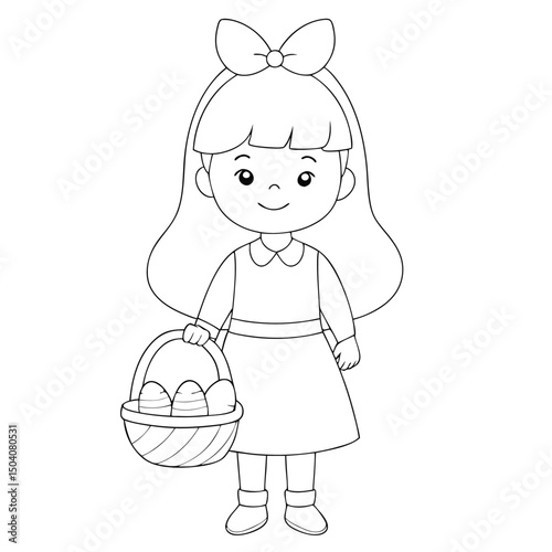 Line art shows a young girl with basket filled with eggs