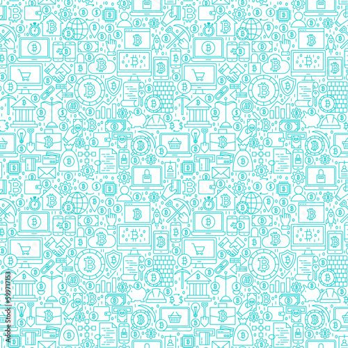 Line Cryptocurrency White Seamless Pattern. Vector Illustration of Outline Tile Background. Bitcoin Financial Items.