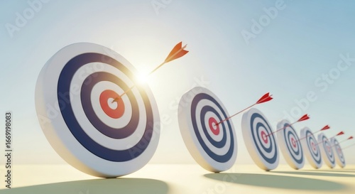 Line of Bullseye Targets with Arrows Symbolizing Success, Achievement, Accuracy, and Strategic Planning towards Goals, bathed in warm sunny light.