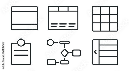 Line style icons of project management: interface layout icon, tabbed sections screen, sidebar menu badge, module navigation grid, user input zones, flowchart path icons, wire navigation panel.