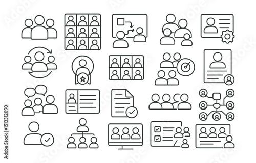 Line style icons of team and collaboration: project team icon, team avatar grid, collaboration board, profile group tag, role assignment tile, team sync icon, contributor badge, user directory, team