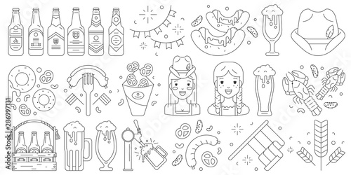 Linear icon collection for oktoberfest celebration. Beer festival symbols, sych as mugs, bottles, pretzel, sausage. German octoberfest waitress character, trendy flat design vector illustrations set.